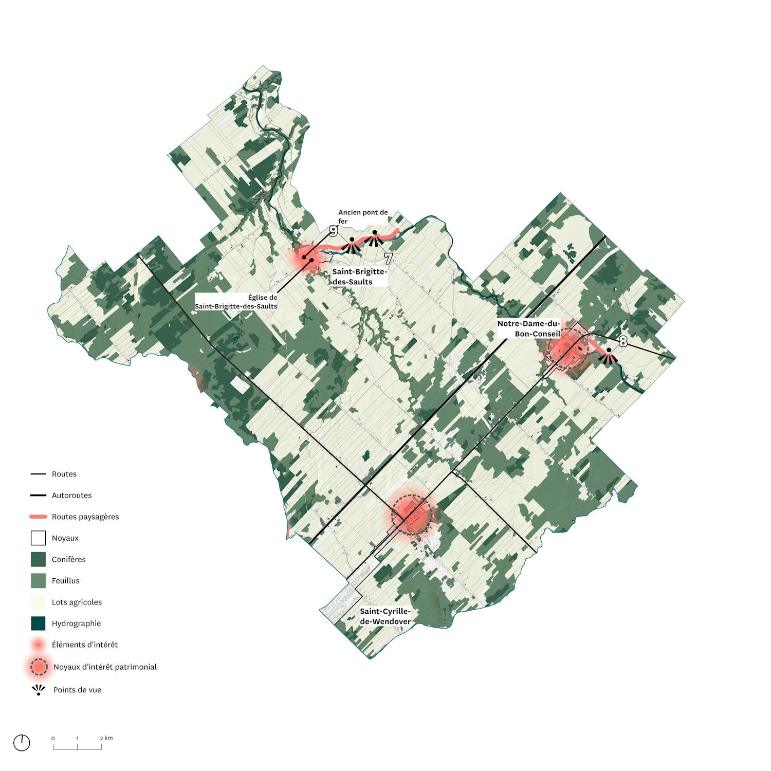 La première étape de réalisation était le découpage en unités de paysage, qui a permis de séparer la MRC en 11 ensembles distincts, en se basant à la fois sur le Cadre écologique de référence du Québec (CERQ) et sur les intrants fournis par la MRC. Une visite terrain par la suite a permis de raffiner notre découpage et d’aller expérimenter les paysages de manière empirique. Cette visite a aussi été l’occasion de qualifier les paysages forestiers, agricoles, riverains et les noyaux villageois tout en notant certains éléments d’intérêt imperceptibles à l’échelle cartographique. Par la suite, chaque unité a fait l’objet d’une fiche représentant les particularités et les dynamiques paysagères à l’œuvre dans l’unité, accompagnée par un travail cartographique et des photos appuyant les constats et les analyses. Ces fiches comprennent aussi des propositions de mise en valeur correspondant aux enjeux particuliers de chaque unité. Finalement, une synthèse cartographique et des propositions de mise en valeur à l’échelle de la MRC ont été formulées.